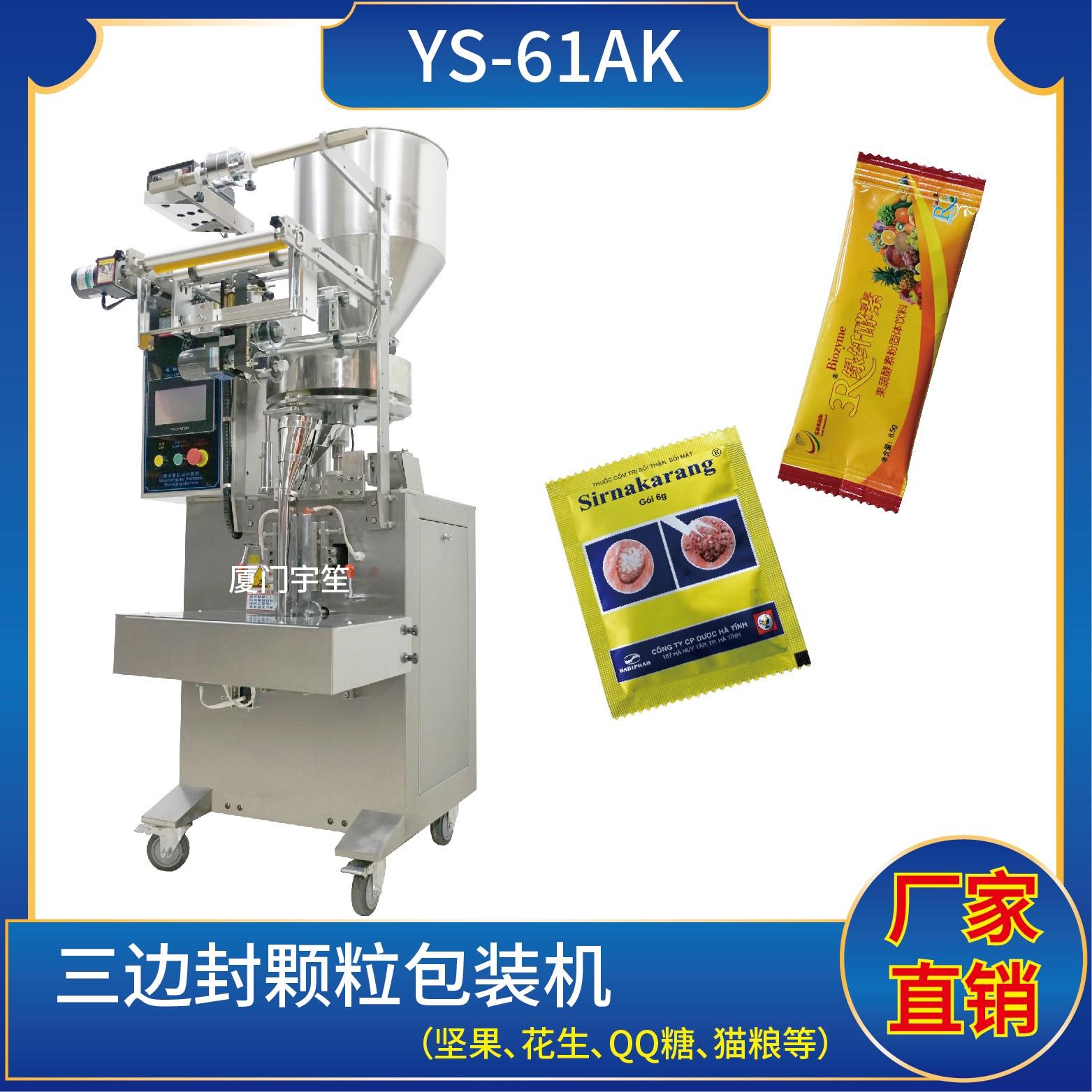 YP-61AK 三邊封顆粒包裝機特點1、適用于食品、醫(yī)藥、化工、化妝品行業(yè)中顆粒物品的計量包裝。2、可自動完成制袋、計量、下料、封合、分切、計數、且可根據客戶要求配置打印批號等功能。3、觸摸屏操作,PLC 控制,驅動步進電機控制袋長,性能穩(wěn)定、調整方便、檢測準確。智能式溫控儀,PID調節(jié),保證將溫度的誤差范圍控制在…